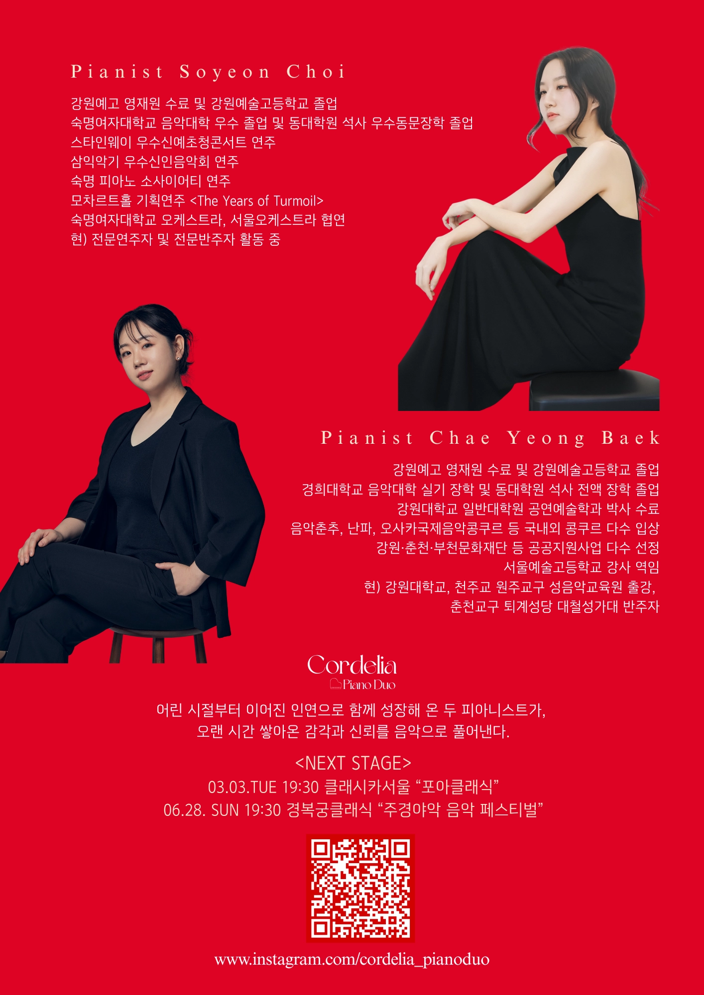 모차르트 탄생 270주년 코델리아 피아노 듀오 리사이틀 어린 시절부터 이어진 인연으로 함께 성장해 온 두 피아니스트가,