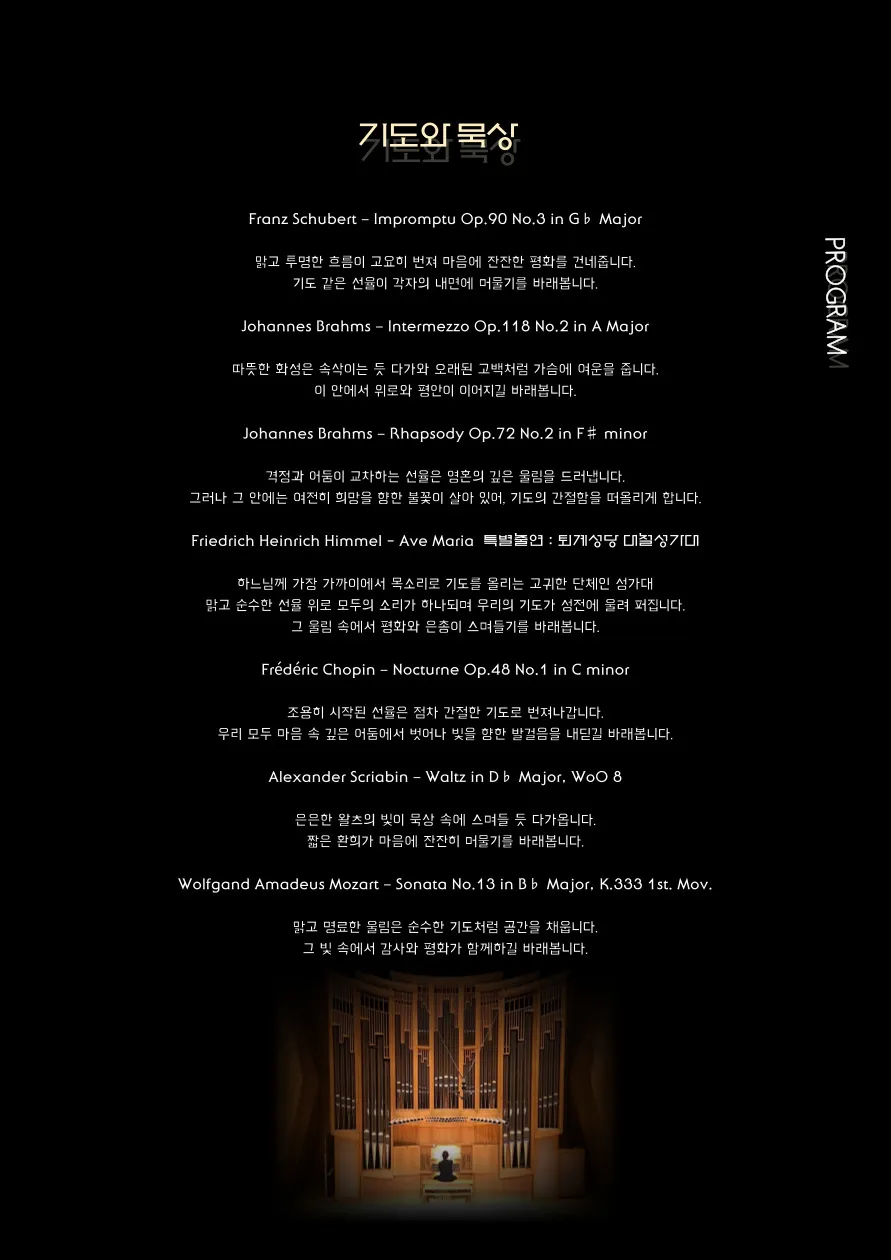 프로그램은 슈베르트의 섬세한 즉흥곡, 브람스의 인터메쪼와 랩소디, 쇼행의 간절한 녹턴, 스크리아빈의 왈츠